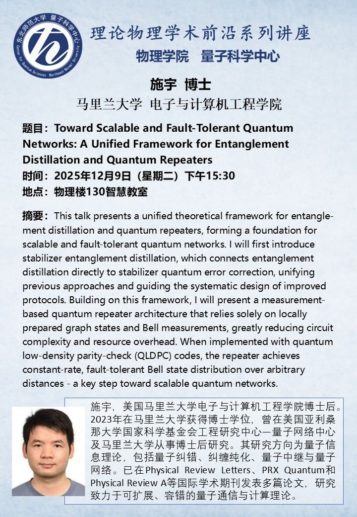学术报告:Toward Scalable and Fault-Tolerant Quantum Networks: A Unified Framework for Entanglement Distillation and Quantum Repeaters (施宇)