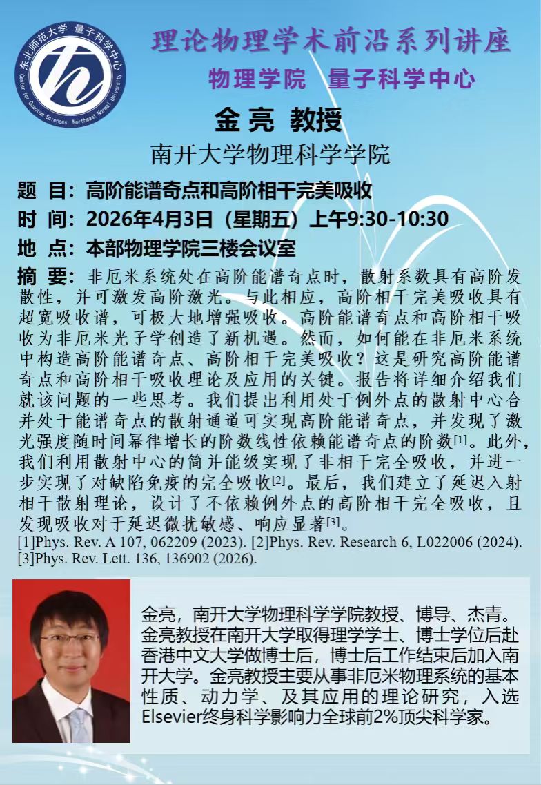 学术报告:高阶能谱奇点和高阶相干完美吸收(金亮)